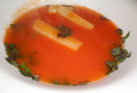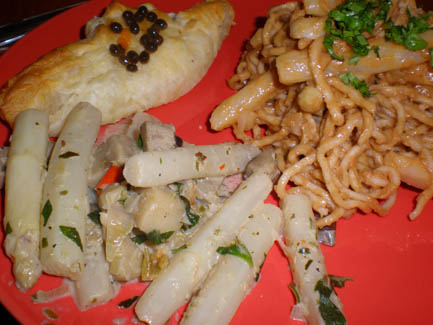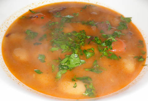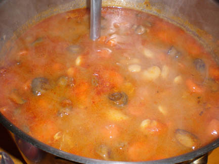 (If using bacon, remove the bacon and dice. Return to the pot.) In a small saucepan, melt the butter, add the flour and stir until you have a roux, add the paprika, stir again, and stir in a ladlefull of the soup liquid. Transfer the paprika paste to the soup pot, stir, bring to a boil and let simmer for 10 minutes. Taste for salt and pepper. If you like it, add chopped parsley when serving the soup.