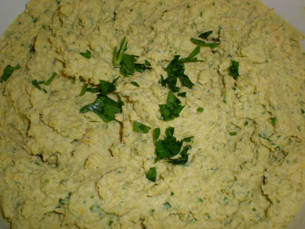 way. Add the Tehina paste and mix well with the fork. Crush the garlic cloves