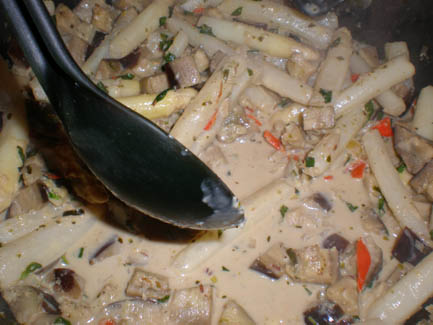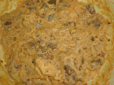the eggplant will be slightly watery, so mix it with a fork which would at the