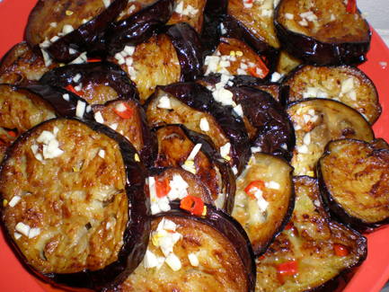 Heat oil in a frying pan and fry eggplant slices over high heat, turning them over until they brown on both sides; add more oil if necessary. Remove with a slotted spoon, place on a serving platter and set aside.
