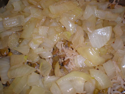 # Fry chopped onions and grated carrots in olive oil at medium to high temperature.