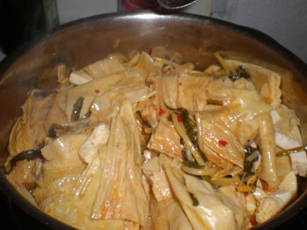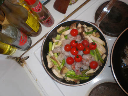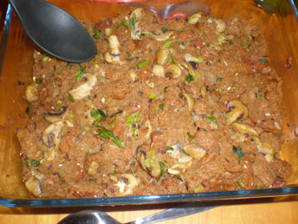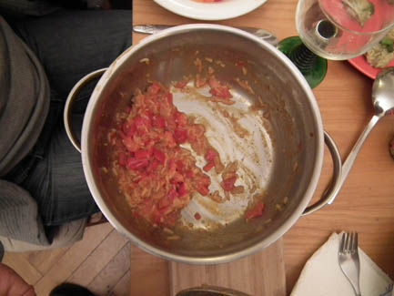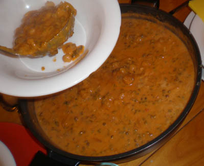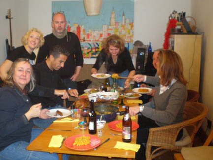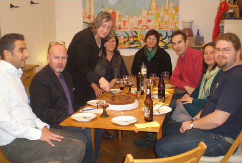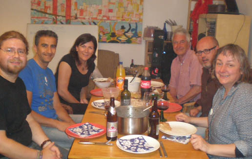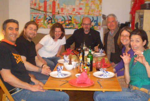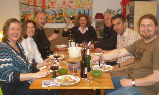 <Many hungry cookers: Cyrus, Ralph, Kerstin, Christiane, Amina, Klaus, Annette and Daniel >the mushroom sauce for the Aushak |