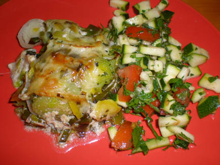 <Leek Gratin with much cheese >Zucchini (courgette) salad |
