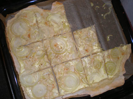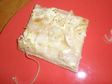 Arrange the dark green leeks on top, then cover with a third of the grated cheese and all the bleu. Add half of the white and light green leeks, then top with the rest of the cream. Add the another third of cheese, then the rest of the leeks, then the rest of the cheese, and top with chives.