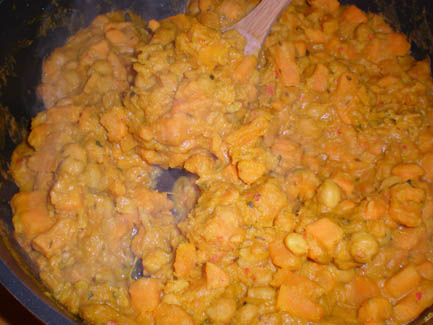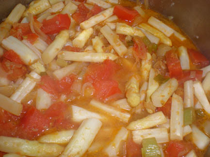 Add potato and stock, bring to a boil, lower heat, cover, and simmer about 10 minutes, until the veggies are tender.