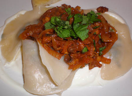 <a very rich veggie soup > the wonder of the Aushak, on a bed of garlic yogurt, topped with mushrooms and mint |