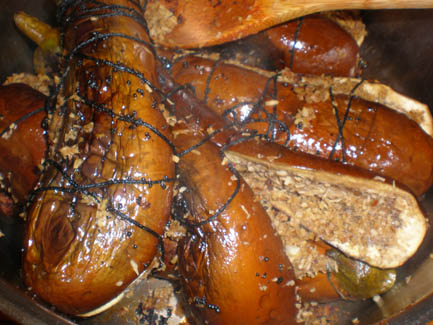 <Noni >bondage eggplants get tied up to keep their stuffing inside before cooking |