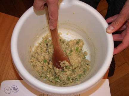 the dumplings: Combine the chopped scallion tops, salt, pepper, red pepper flakes